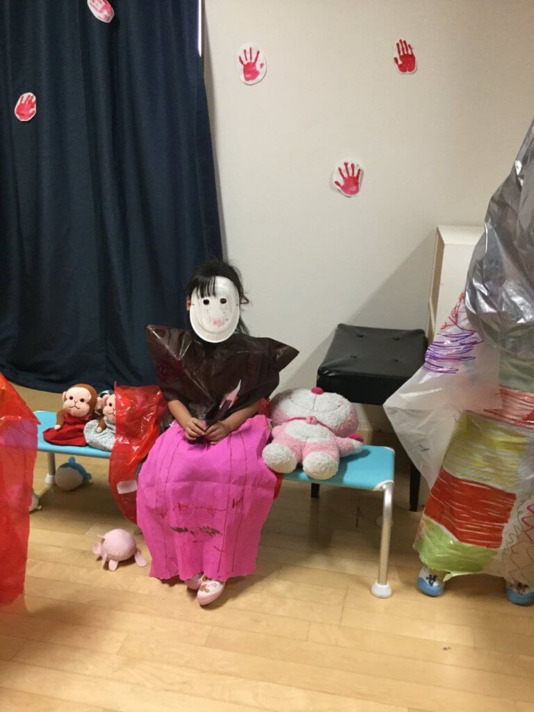 お化け図鑑などを見ながら、自分たちで衣装や小道具を作りました。当日はおばけになりきって年下の友だちを驚かせました。乳児クラスの子どもたちには怖がってしまわないようにするためにはどうしたらいいか話し合い、「部屋の電気をつけておこう!」「ぼくたちが保育室に行ってみよう!」という意見が出たので、乳児クラスの部屋に衣装や小道具を披露し、満足気な子どもたちでした。