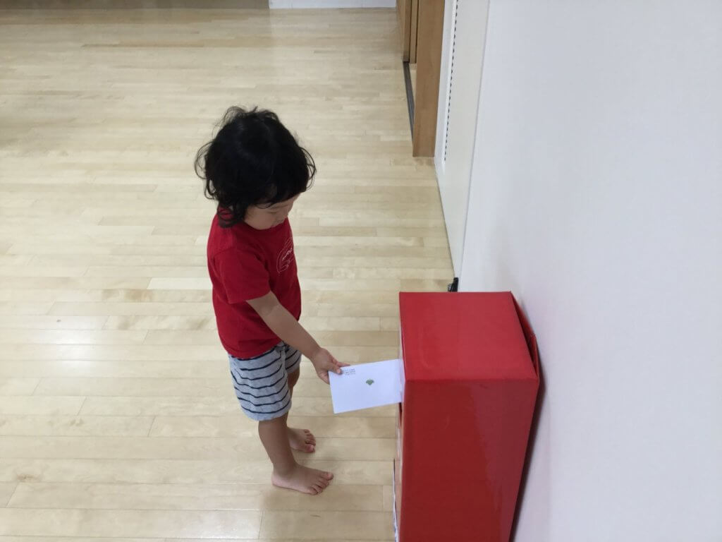 0~2歳児クラスの子どもたちは、園内に設置した小さなポストに投函しました。「入ったかな?」と嬉しそうにのぞきながら、投函を楽しんでいました。