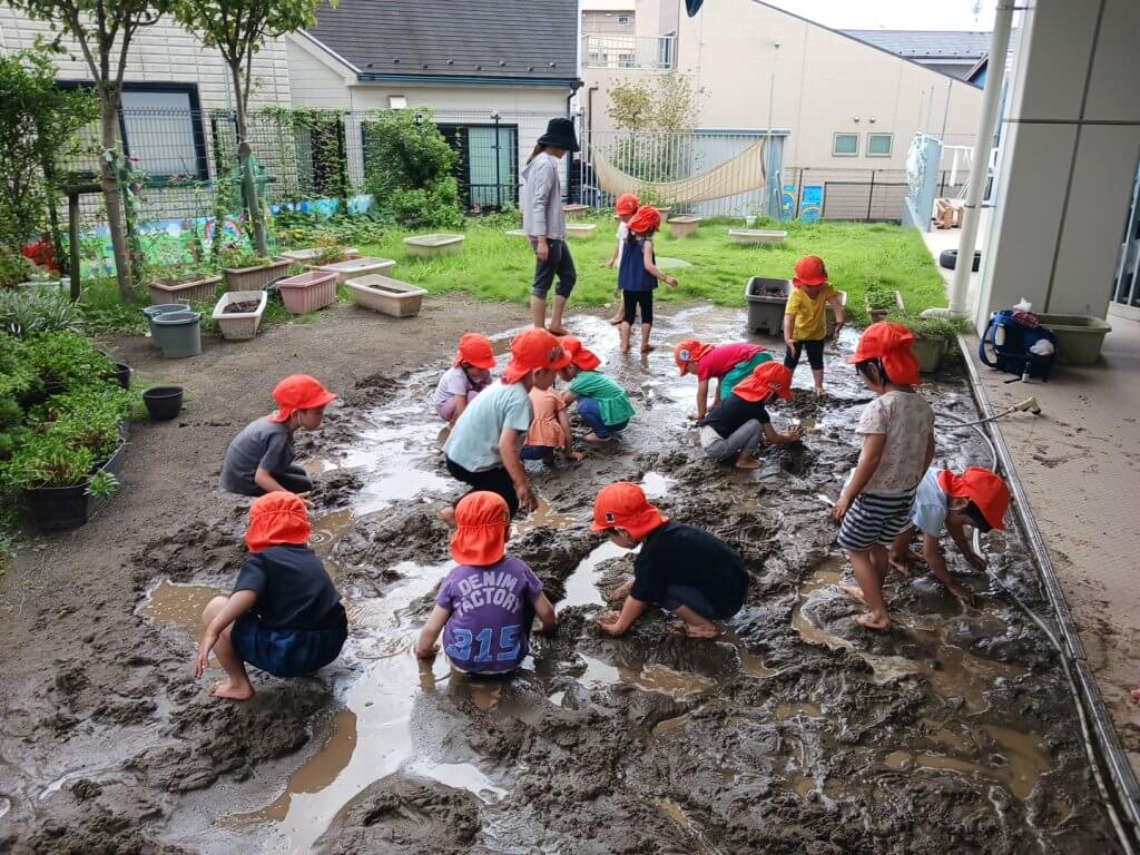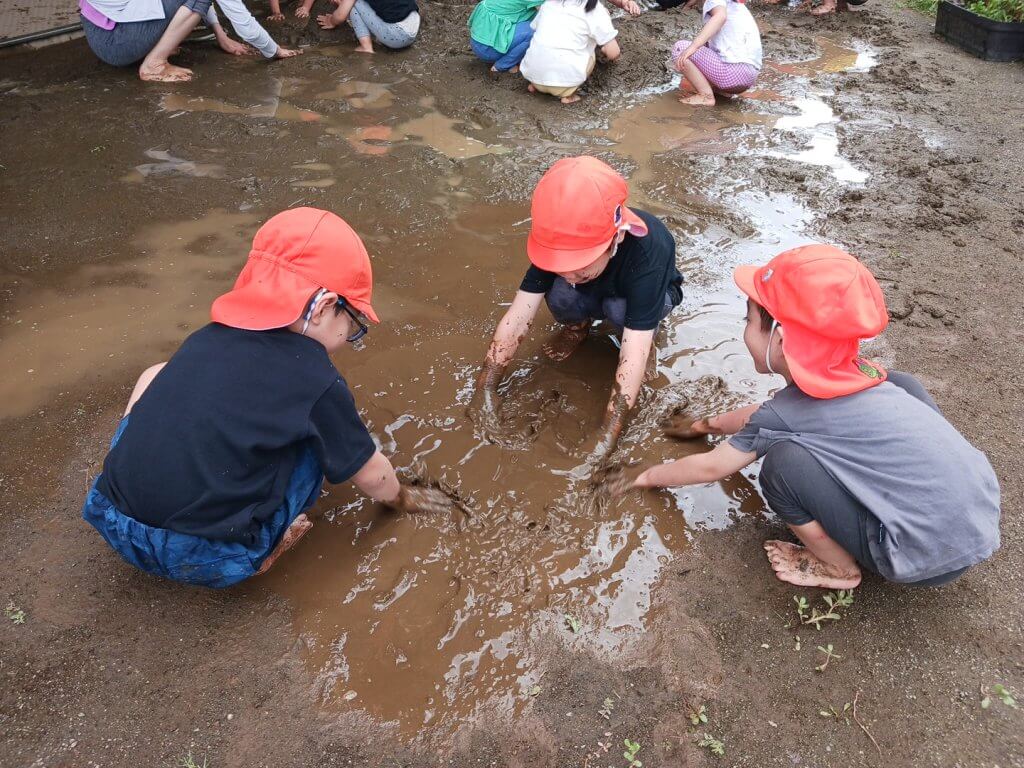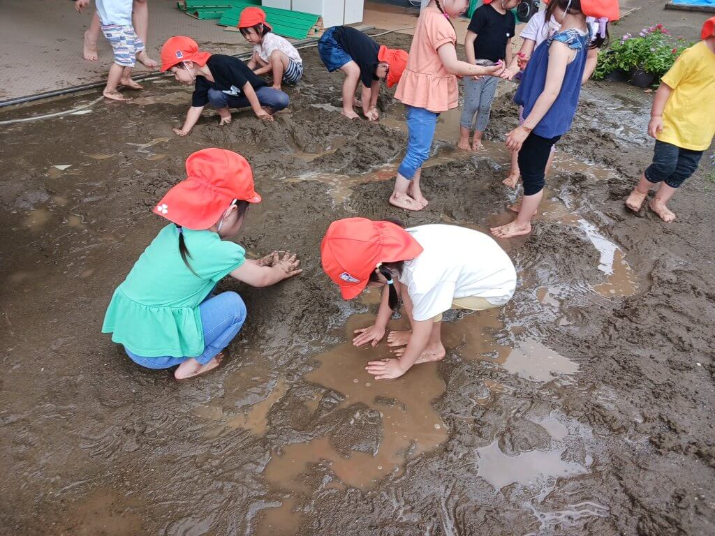 3歳児のもり組の子どもたちは園庭でどろんこ遊びをしました。友だちと一緒に手分けして山を作って水を流して川を作ったり、泥のひんやりとした感触や、硬さの違いを手足で感じたりしながら楽しみました。