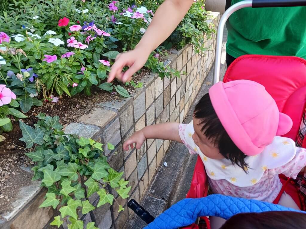 散歩先でお花や店先にあるペンギンのぬいぐるみなどを見つけて楽しんでいます。お友達と手を繋いで歩くこともできるようになっています。