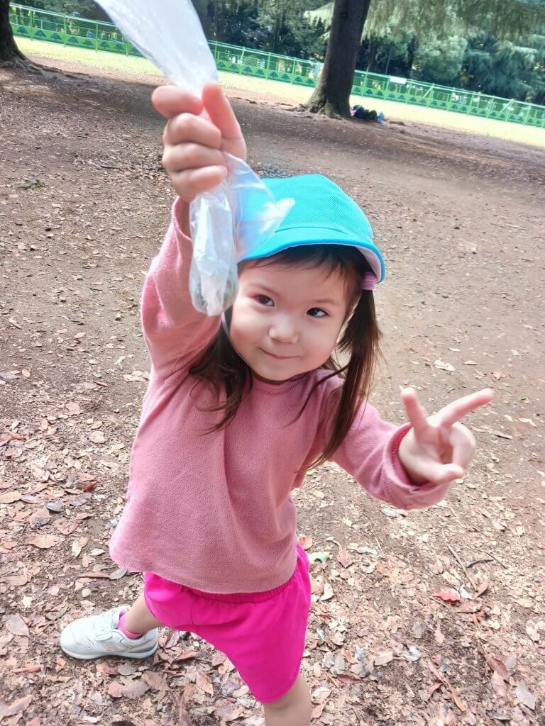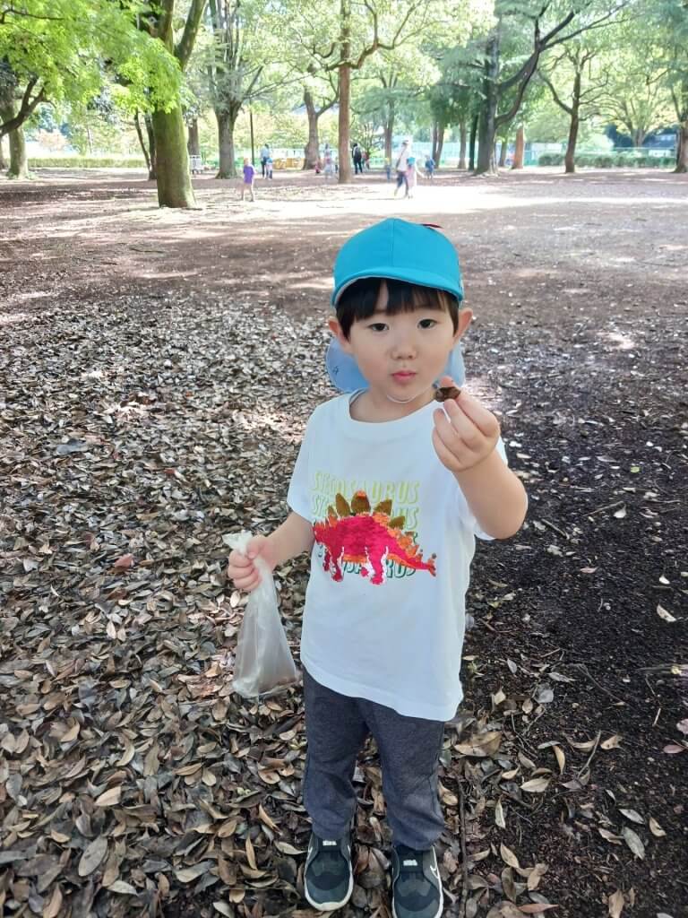 代々木公園に行って遊びました。公園を探索していると、ドングリやきのこなど様々な発見があり、保育者や友達に見せていました。