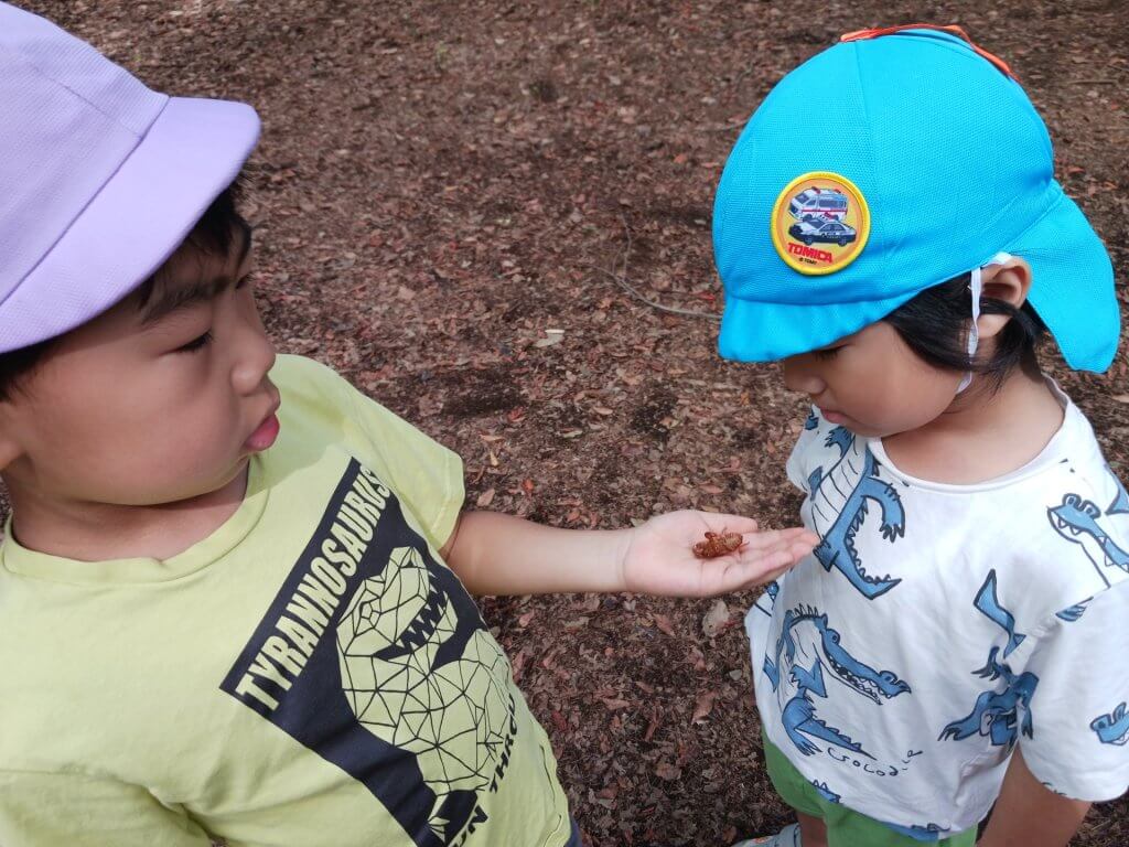 セミの抜け殻も見つけました。興味津々なお友達に年長児が優しく見せてあげていました♪