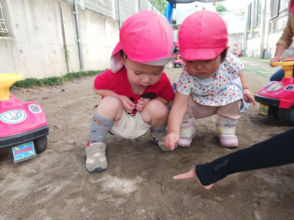 園庭でミミズ発見!最近は生き物に興味津々ないちご組です。