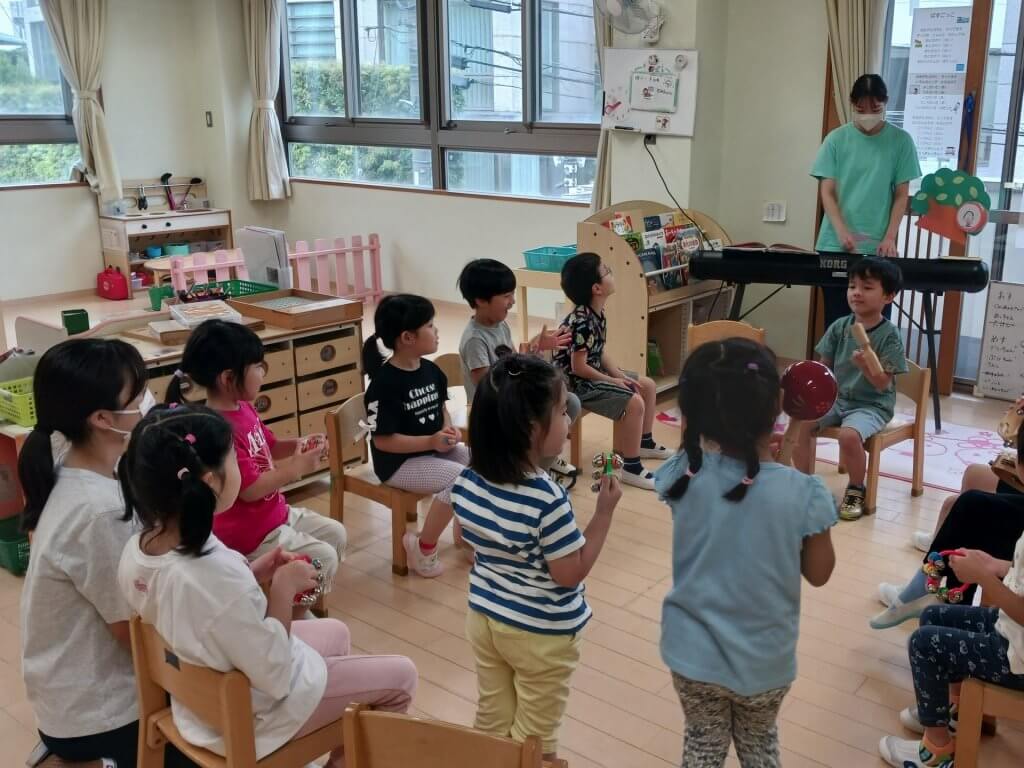 あお組音楽隊で季節の歌「山の音楽家」に合わせて、楽器遊びを楽しみました♪様々な楽器の音を楽しみ「こんな音なんだ!」「もっとやりたい!」と大盛り上がりでした!