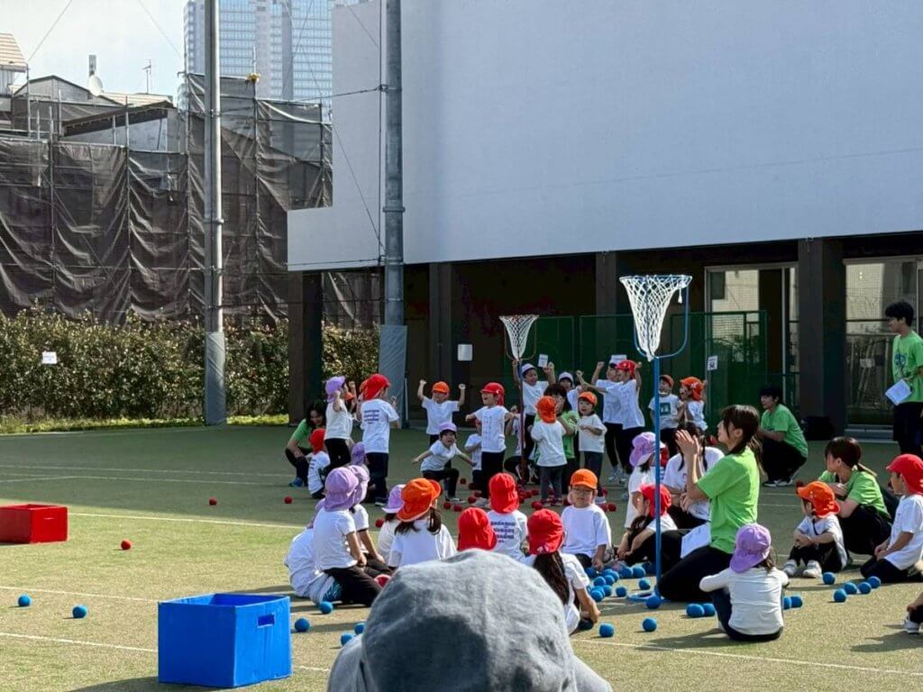年下の友だちに玉を渡したり、投げ方を教えたりしながら、力を合わせ玉入れに挑戦しました!