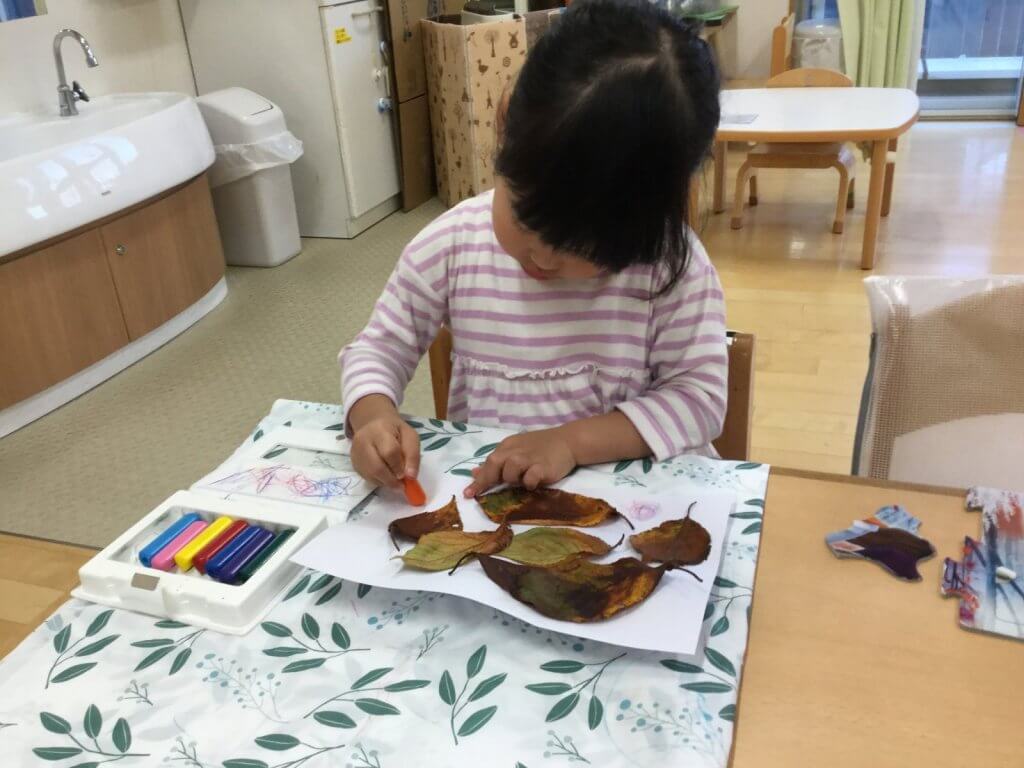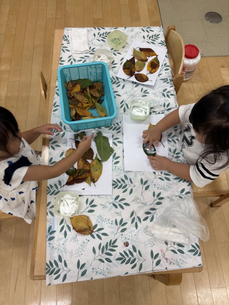 落ち葉の形や色の違いを発見! 拾った落ち葉を「紙に貼りたい!」という呟きから制作遊びをしました。お気に入りの落ち葉を画用紙の上で並べた後は、自由にお絵描き!一人ひとりが感じた秋が表現されている素敵な作品が完成しました。