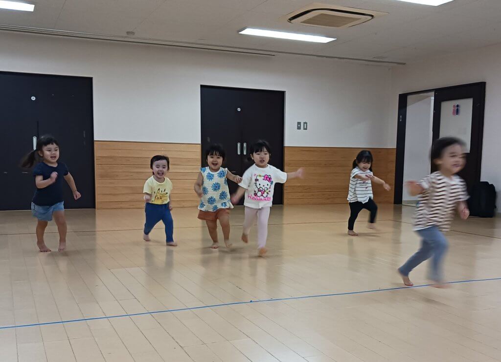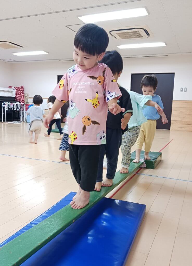 にじ組の子どもたちは、ホールで体を動かして遊んでいます。巧技台ジャンプや一本橋、ケンケンパなどの様々な体の動かし方をしながら楽しんでいます。かけっこも大好きで、「よーい、ドン!」の掛け声とともに元気に走り出しています!