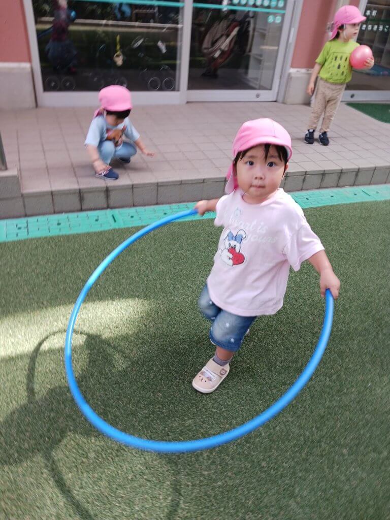体を動かすことが好きな子どもたちは、園庭に出ると、追いかけっこをしたり、ボール遊びをしたり、自然と体を動かす遊びが増えています。フラフ―プでは、電車ごっこをしたり、地面に並べてジャンプをしたりしています。また室内では、マット遊びや一本橋、滑り台などを取り入れ、体を動かす遊びを行えるようにしています!