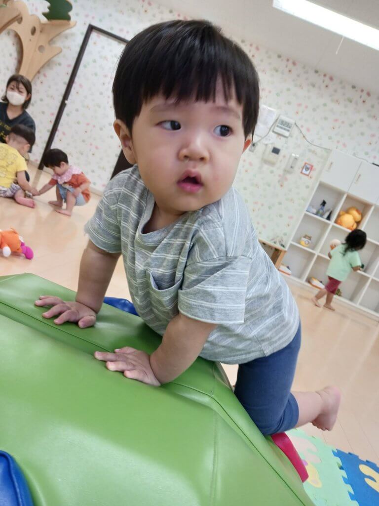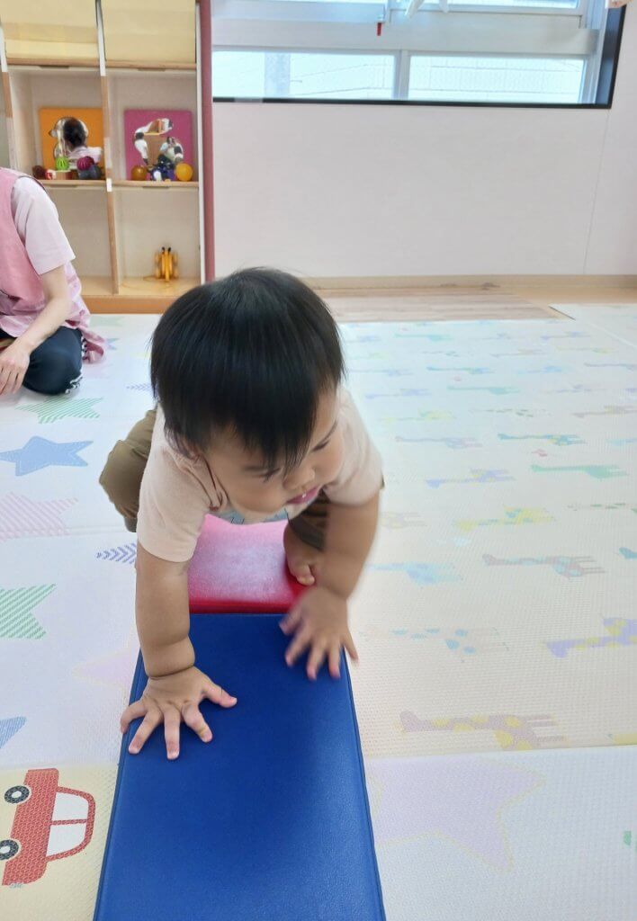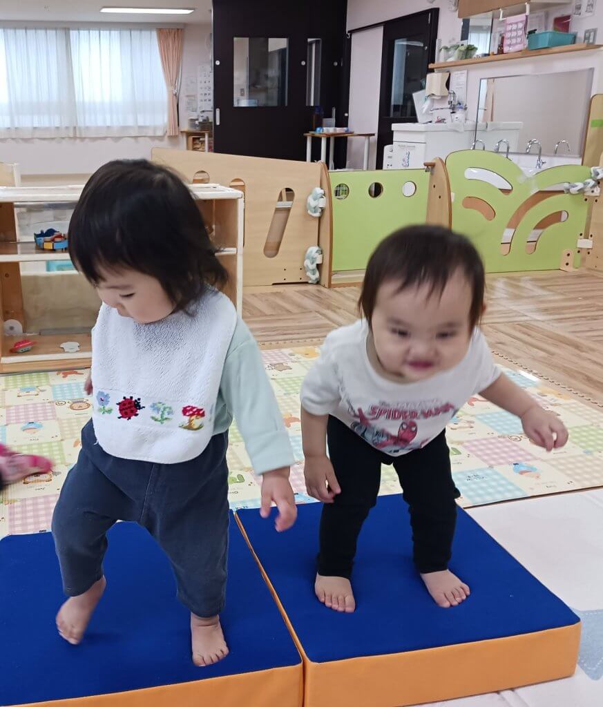 一本橋のマットでは、跨って座って遊んでいた姿から、保育者と手を繋いで立って歩く姿や、自分で立ってみようとする姿が見られるようになってきました。自分でバランスを取りながら立ち上がるタイミングを探っています。トランポリンマットでは保育者の「ジャンプ、ジャンプ」という掛け声に合わせて足踏みしたり、膝を曲げ伸ばしたりと跳んでいる気分を楽しんでいます。また、マットに乗ると少し足が沈む感覚も気持ち良いようです。