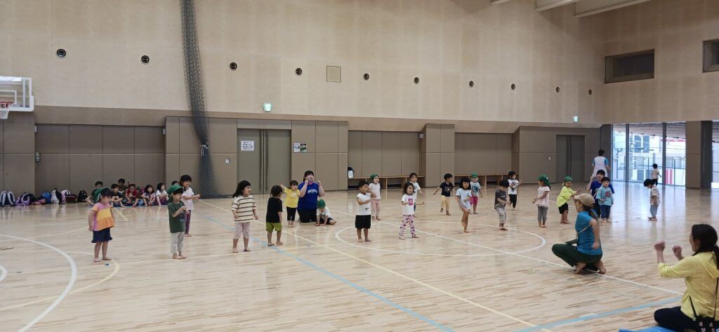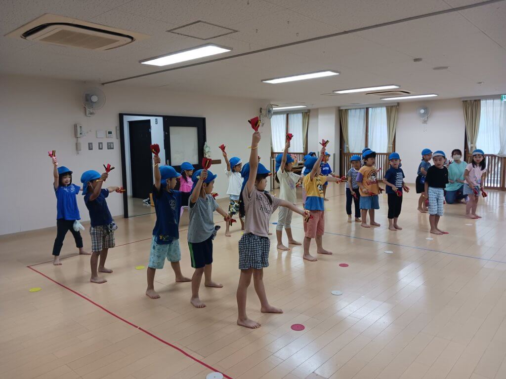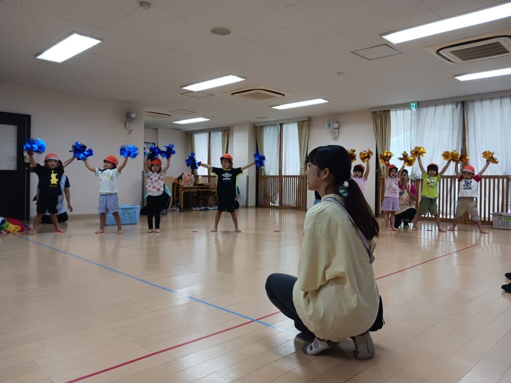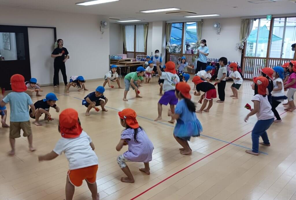 運動会翌週は、各学年で行った遊戯内容をシャッフルにして行い、3歳児は4歳児の遊戯、4歳児は5歳児の遊戯、5歳児は3歳児の遊戯を思う存分楽しみました。年齢の壁を越え、「こうやるんだよ!」とそれぞれが教え合う姿もみられました!