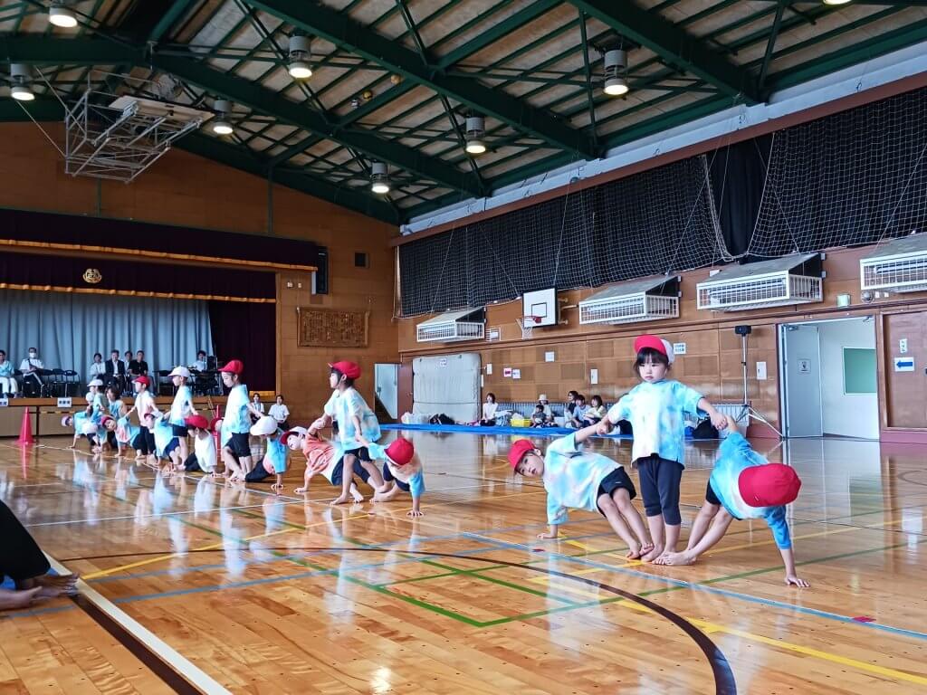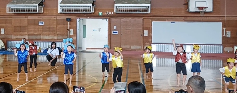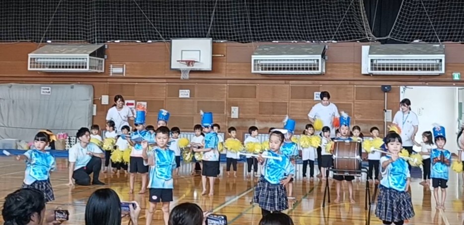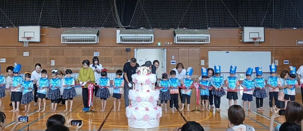 保育園は10周年を迎えました。例年の運動会ははやぶさ組(5歳児クラス)のみでオープニングを行っていましたが、今年は幼児クラス全員で参加し、10周年をお祝いしました。