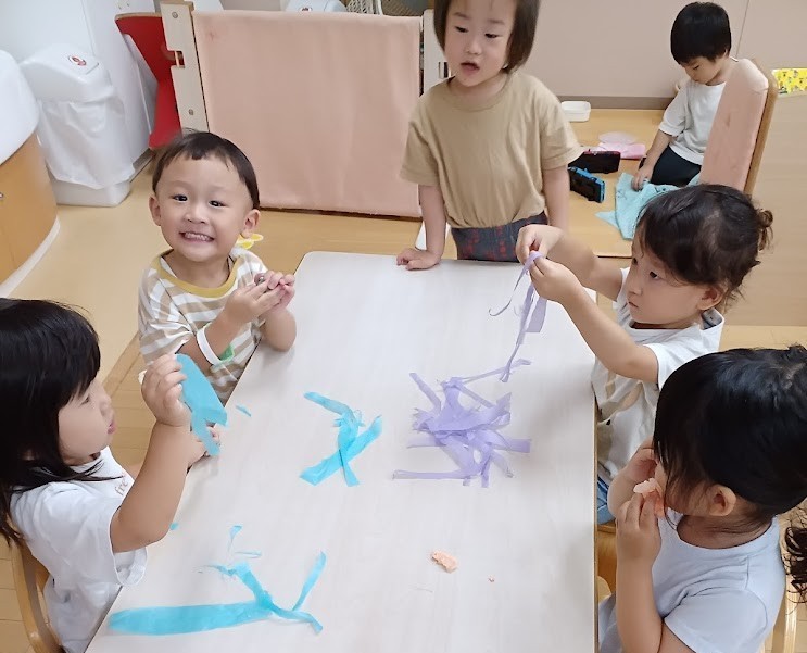 ぺんぎん組(2歳児クラス)はちぎって丸めた花紙を風船の形に切ったカラフルな色画用紙に貼りました。指先を使っての製作が楽しくなってきたぺんぎん組です。