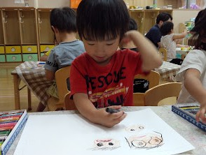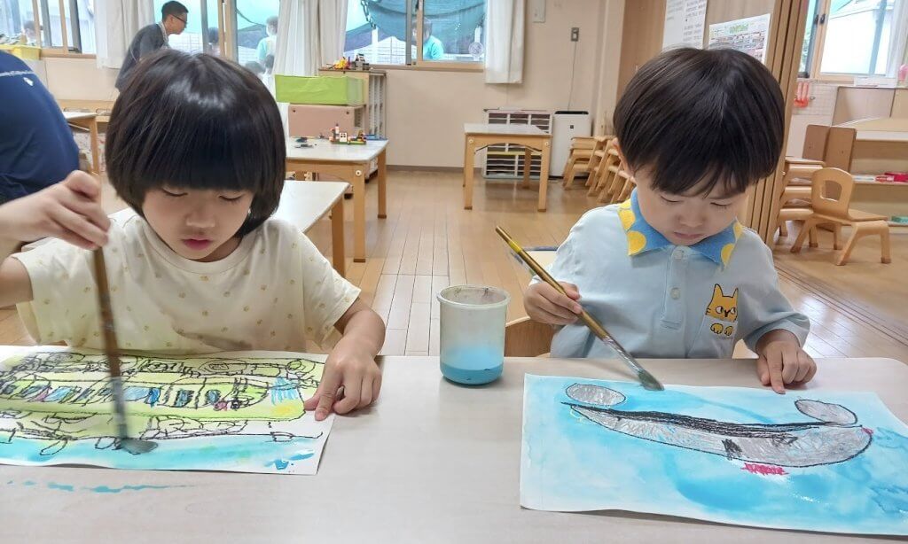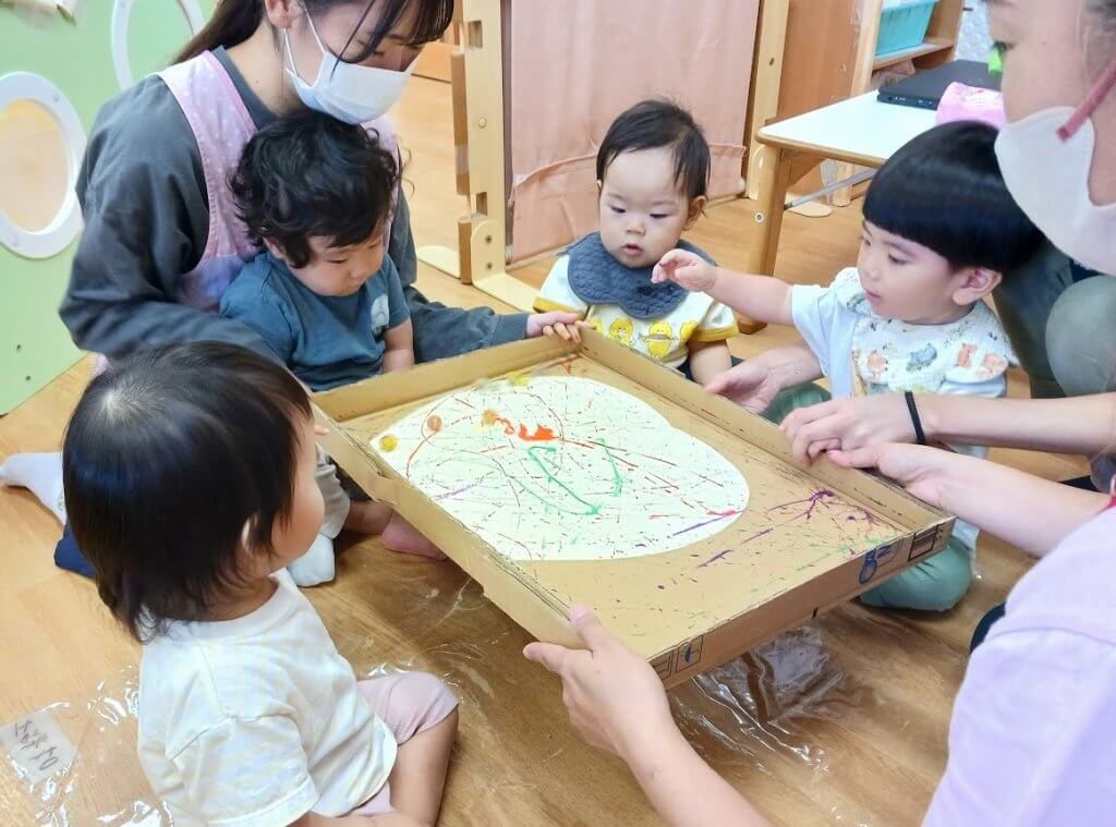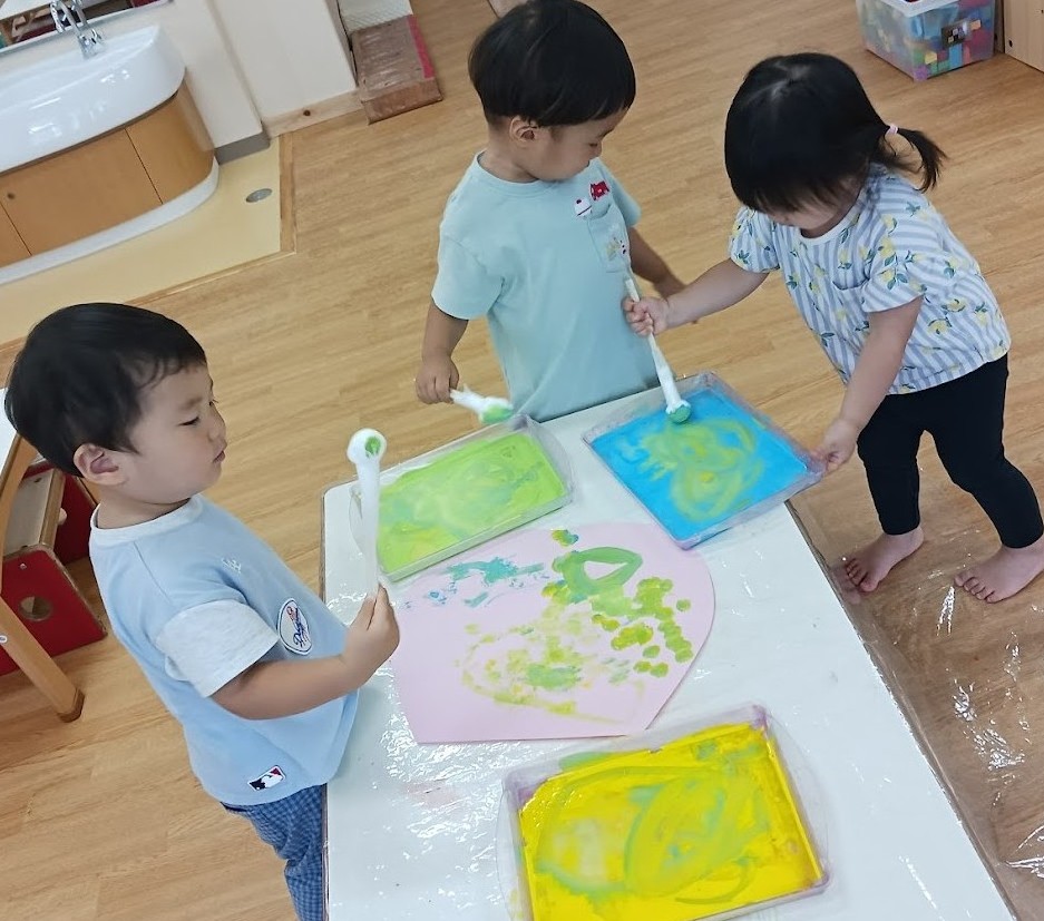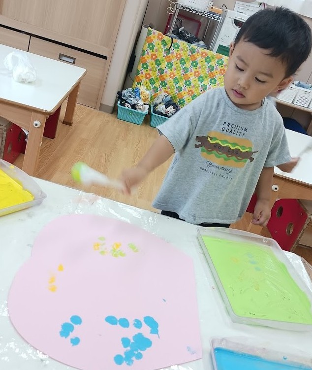 ひよこ組(0歳児クラス)は絵具の付いたビー玉を転がして、あひる組(1歳児クラス)はタンポで気球の模様を描きました。どんどん広がるカラフルな色たちに興味津々の子どもたちですね。
