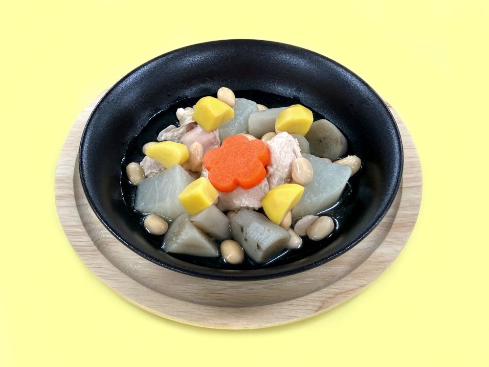 野菜と鶏肉、栗などを砂糖や醤油で甘めに煮込んだ料理です。