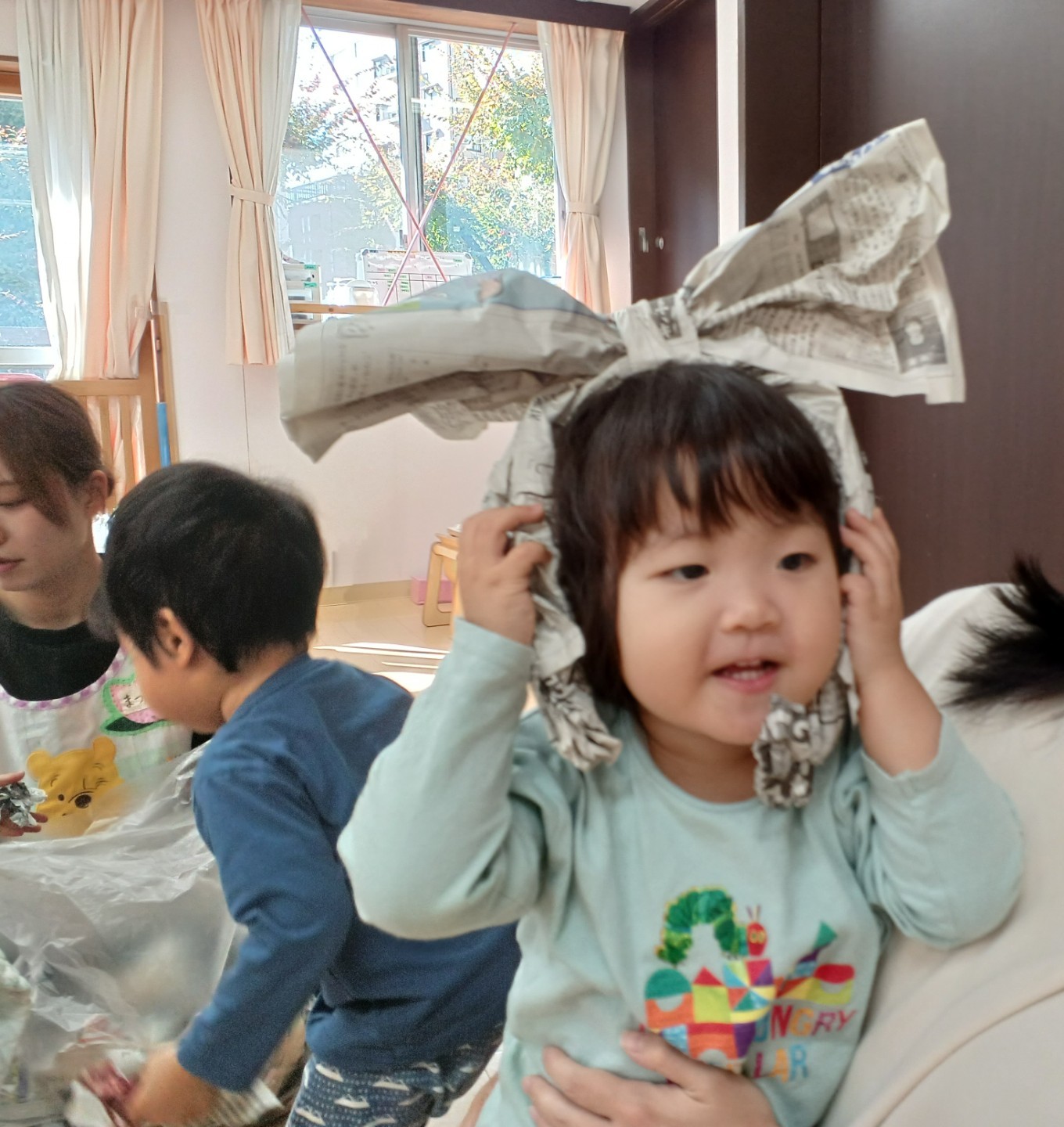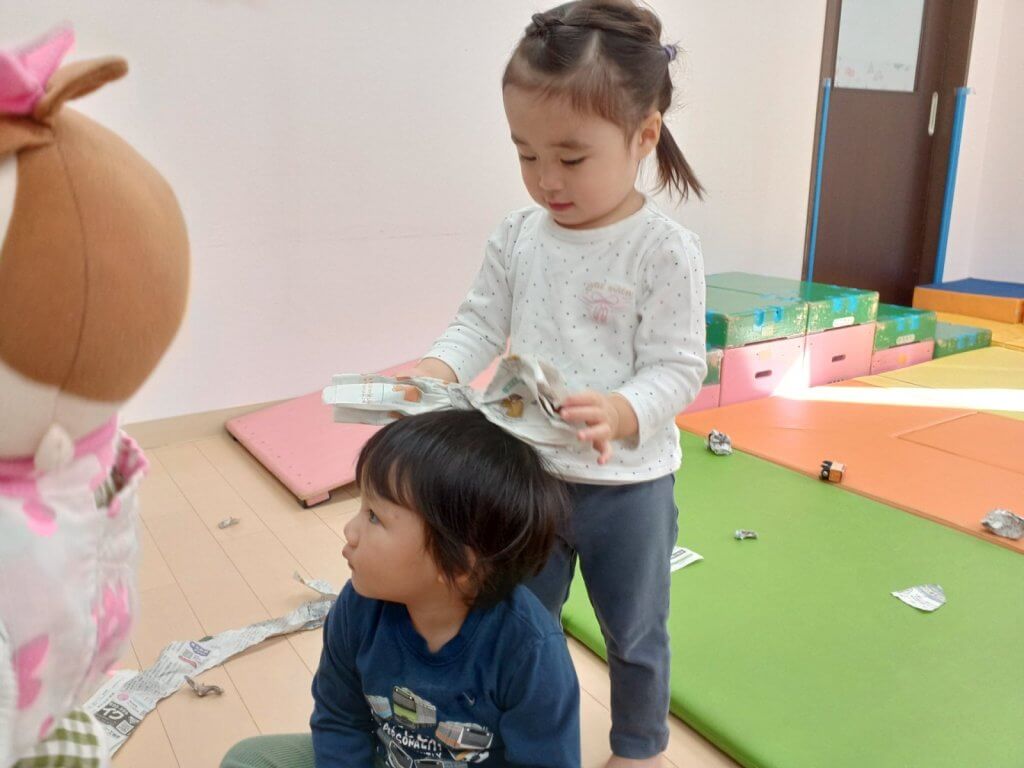 はじめは、びりびりに破いて紙吹雪にして遊んでいた新聞紙。いつの間にかリボンにしておしゃれに変身!