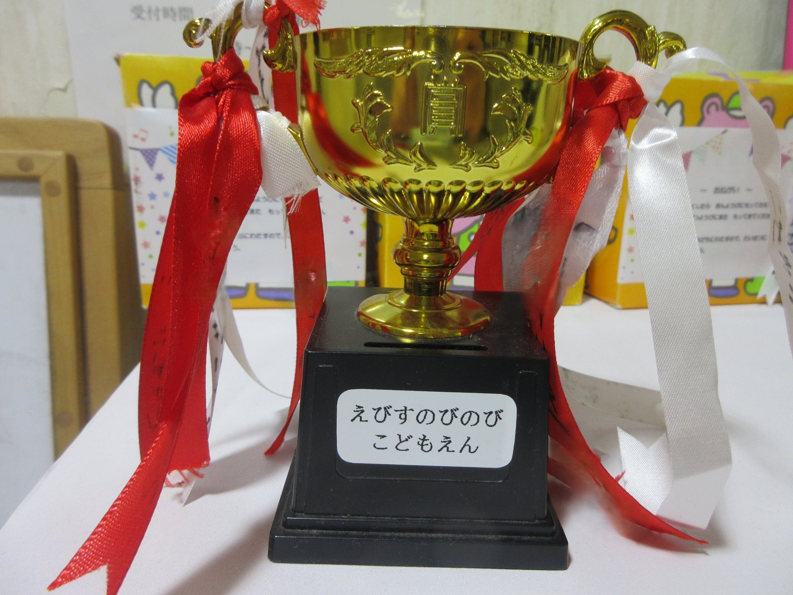 お箸検定に受かると、トロフィーのリボンに名前が入ります。トロフィーは一日家に持って帰り、