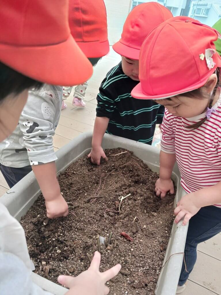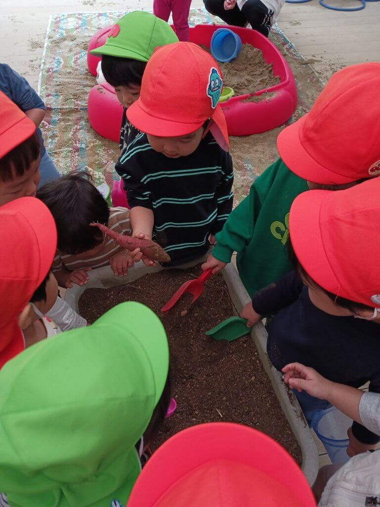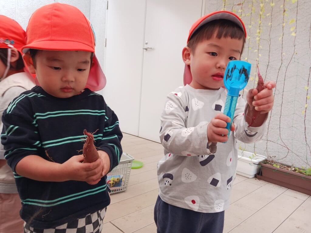 乳児クラス(2歳児)で屋上に取りに行き、一足早い芋ほり体験を楽しみました。