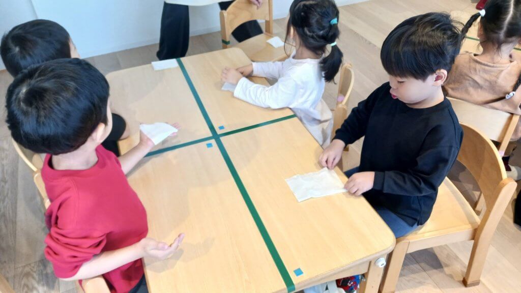 年長児クラスがお当番で机拭きをしているので4歳児クラスにとってはとても良い機会になりました。