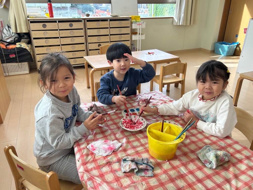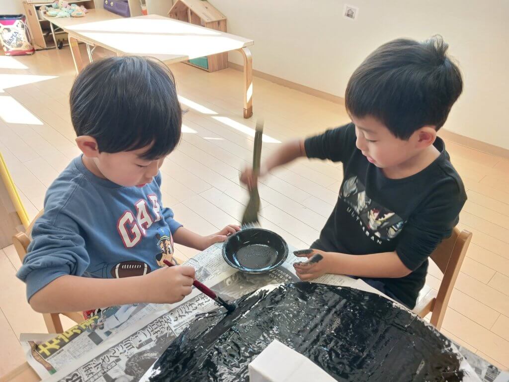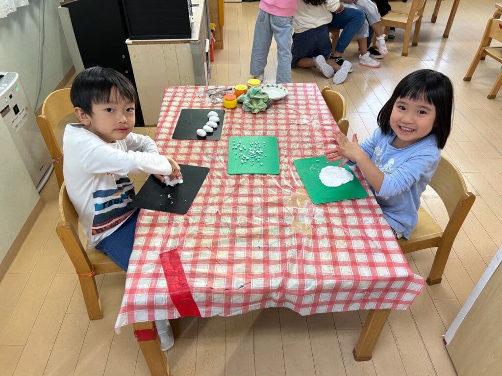 来月のお楽しみ会の劇で使うフライパンとカステラを作りました。お友達と「どんな形にする~?」と楽しそうに粘土をこねて形を作ったり、真剣な表情で色塗りをして丁寧に仕上げていましたよ。本番で使うのが楽しみですね♪