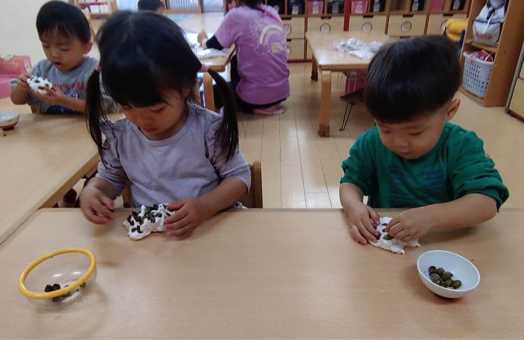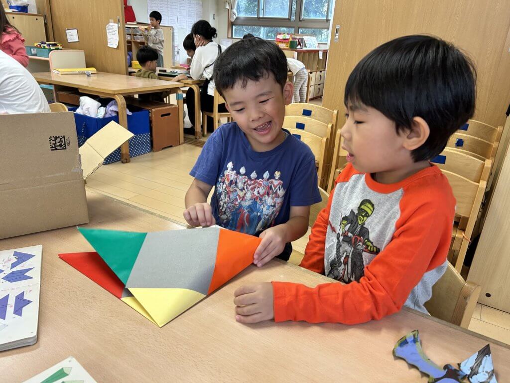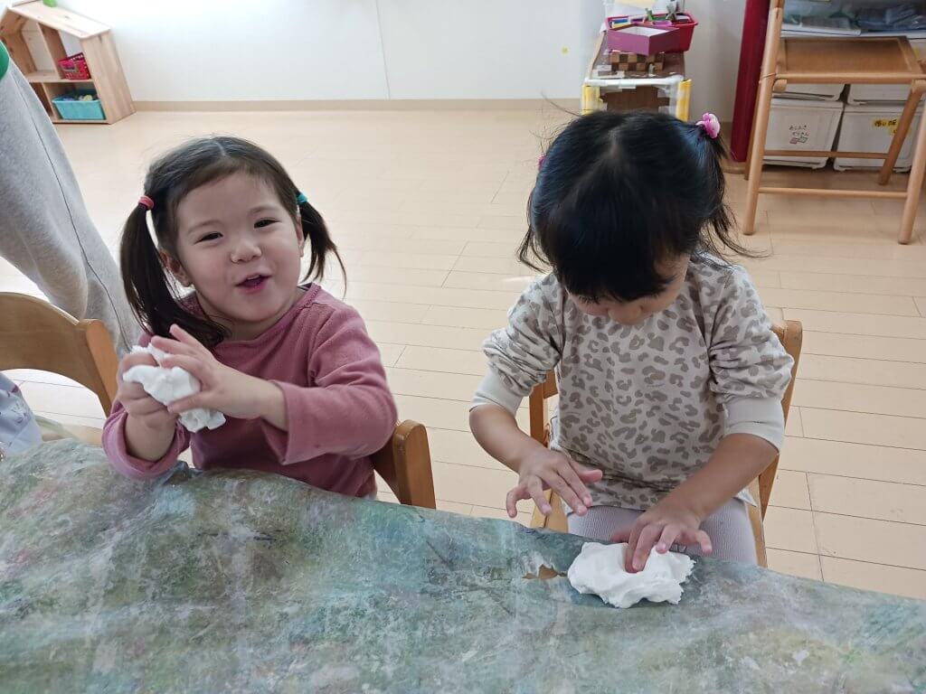だんだんと気温が低い日が増え、子どもたちも「今日は寒いね」「寒すぎてずっとおうちにいたかったよ~」なんてお友達と話しながらきっとすぐに来る冬の訪れを感じています。今月は部屋や園庭で好きな遊びを楽しんだり、来月のお楽しみ会の準備の様子をお届けします!