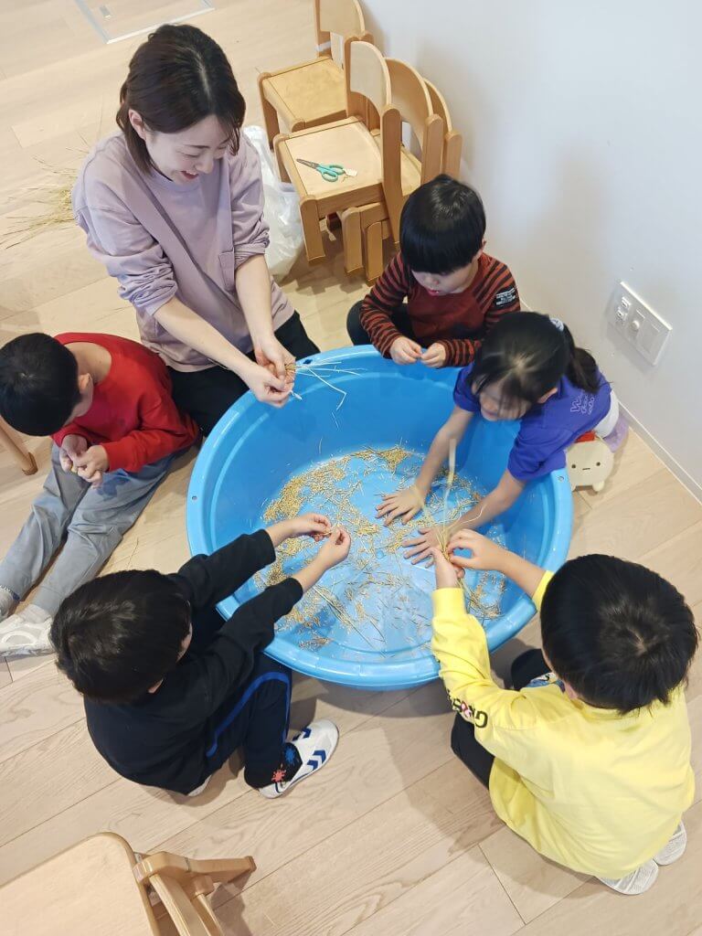 ◎春、年長児が保育者と一緒に稲を植え、秋に稲穂が実ったので稲刈りをしました。
