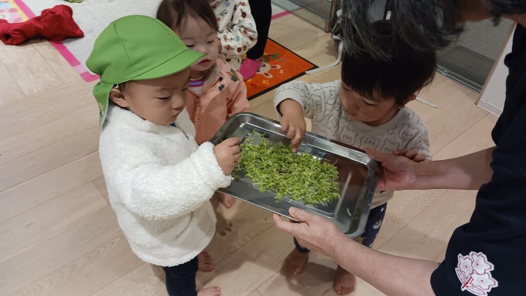 屋上で育てた、白菜の芽を乳児クラスが収穫し、給食のスープに混ぜて食べました!