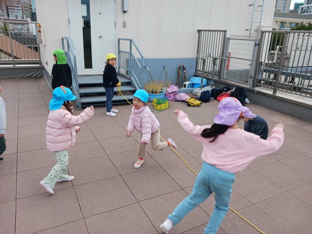 体を動かすことが好きな子供たち。年上の子が楽しそうに大縄跳びで遊んでいる様子を見た3歳児が「い~れ~て~」と集まってきました。年上の友だちを真似したり、やり方を教わりながら一緒に楽しんでいます。