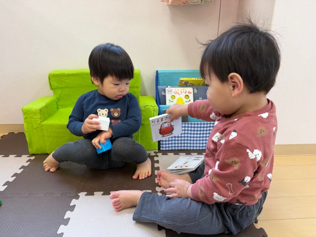 お友達に絵本を「どうぞ!」としているほほえましい場面です!
