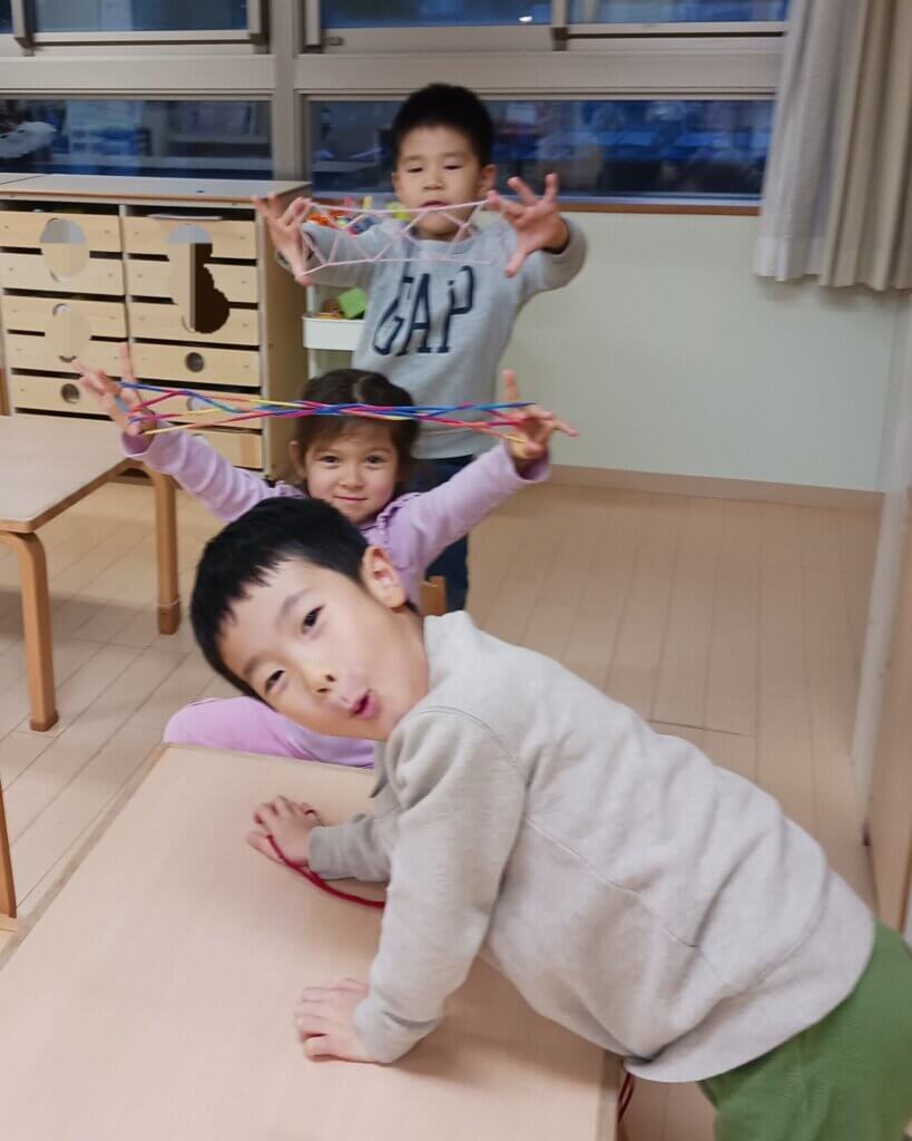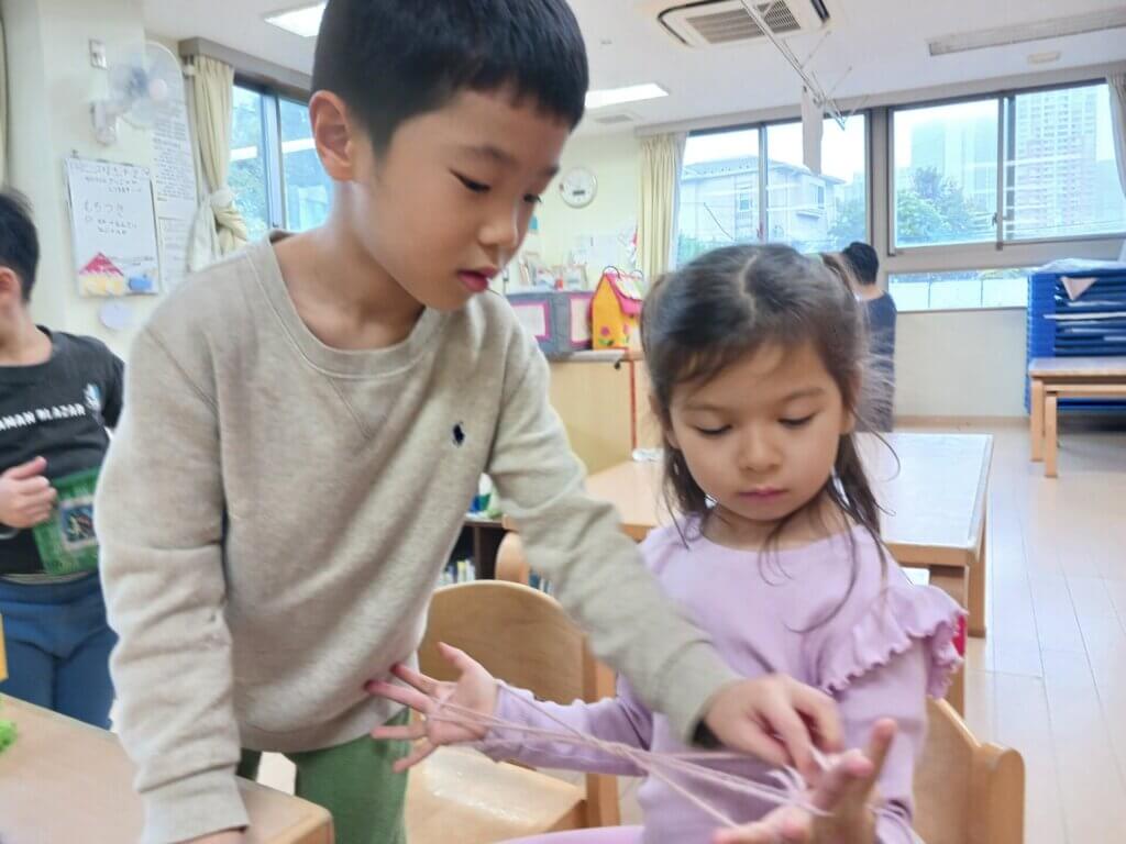 あやとりブームの到来。3,4歳児も保育者やお兄さんお姉さんに教えてもらって、楽しんでいました。上手くいかないことがあっても、「もう一度やろう」と励ましたり丁寧に教えてあげたりしています。