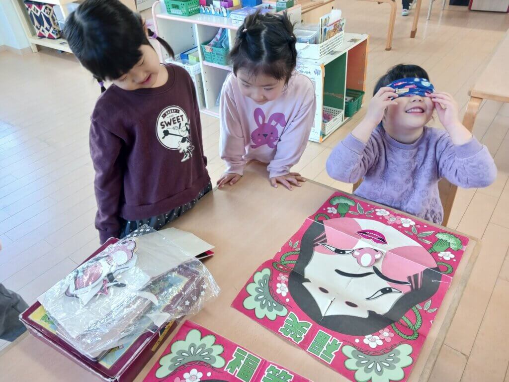 正月遊びを楽しむ子供たち。福笑いでは目隠しをする友だちを見て笑いあったり、完成した面白い顔に盛り上がる様子がありました。