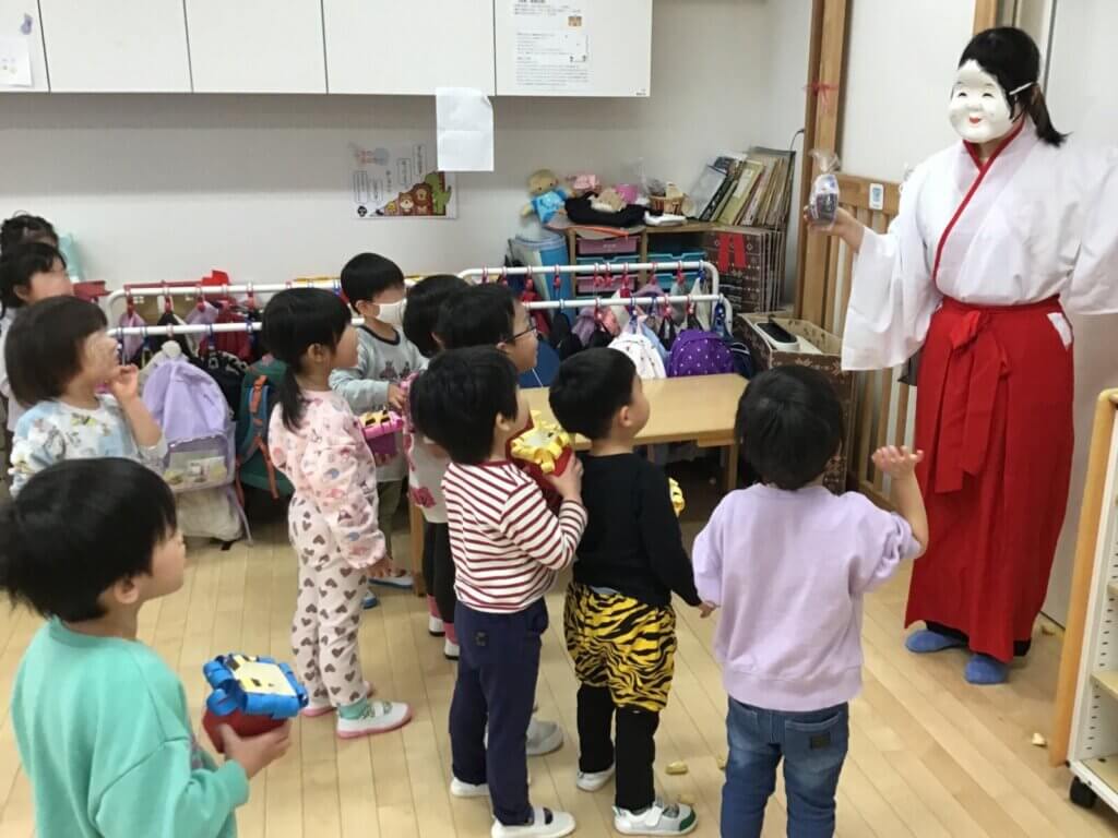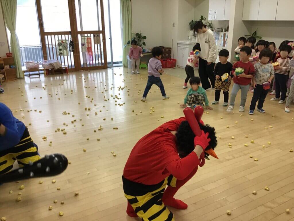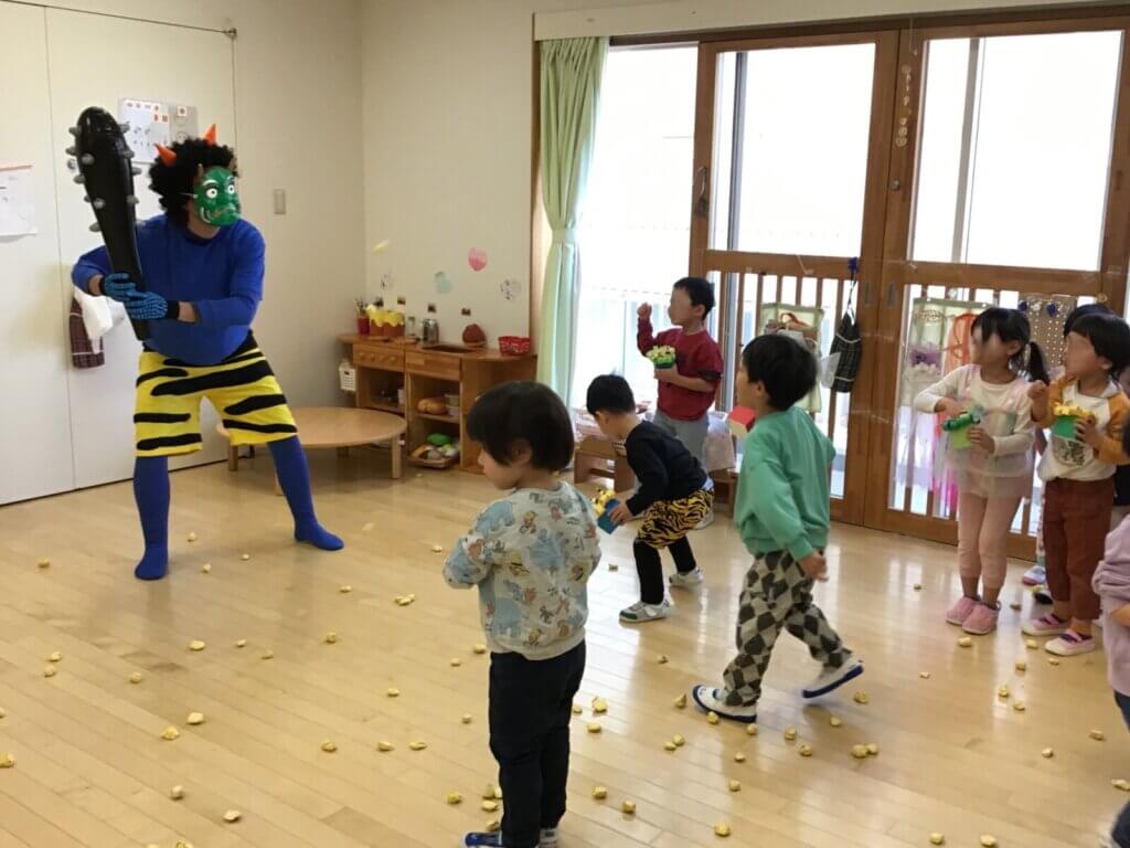 2月3日節分の日。本町そよかぜこども園にも赤鬼、青鬼がやってきました。部屋に入ってきた鬼に驚きながらも、負けじと「おにはそと!」と紙で作った豆を投げて果敢に立ち向かっていった子どもたち。その頼もしい後ろ姿からはこの1年での成長が感じられました。無事に鬼退治が終わり、部屋には福の神が登場。優しい福の神にひと安心した子どもたちからは「おこりんぼう鬼やっつけたよ!」「もう泣き虫鬼いないよ!」などと元気な声がたくさん聞こえていました。