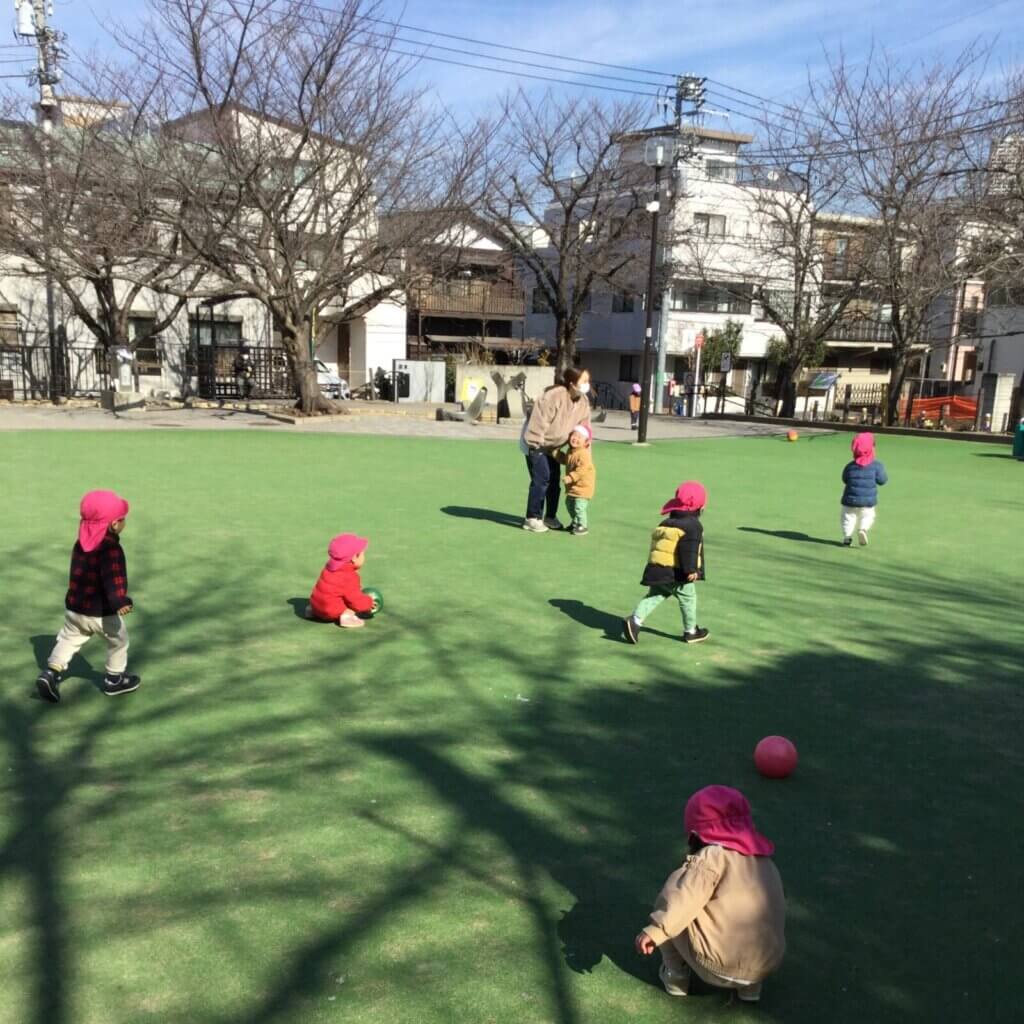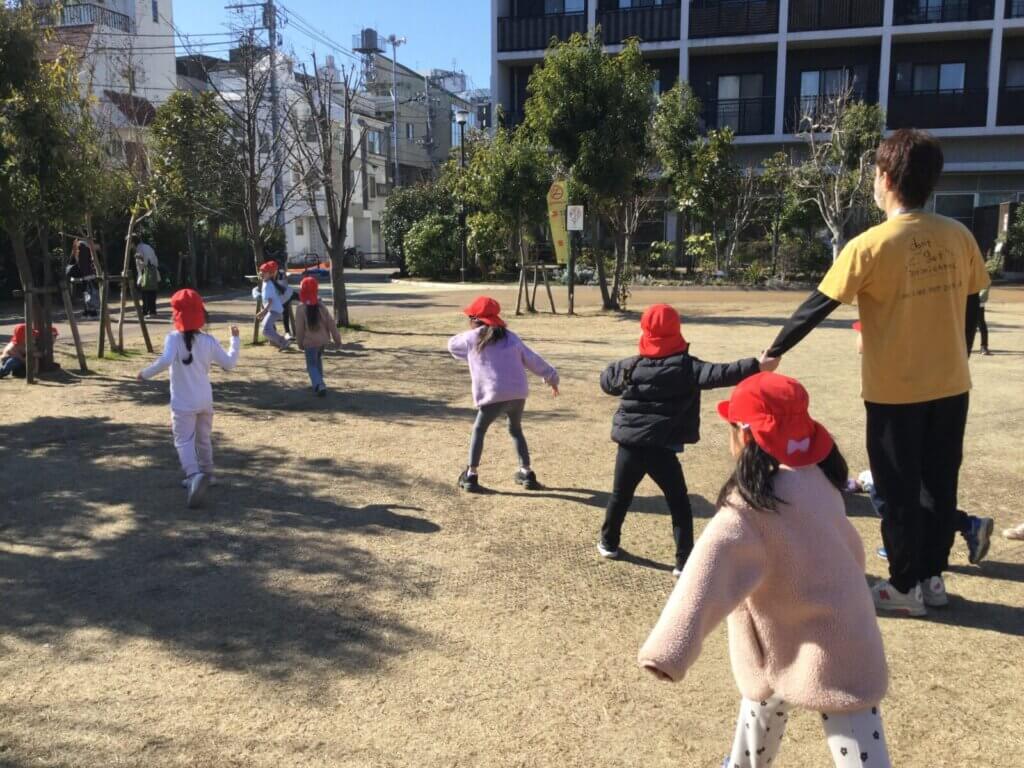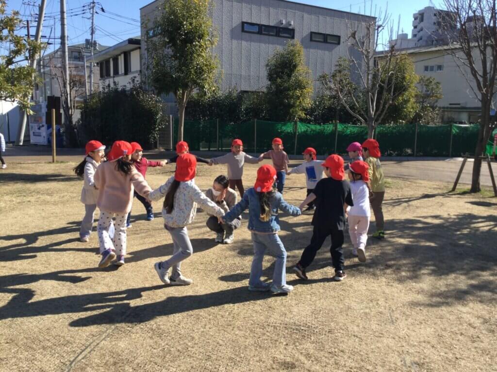晴れた日の散歩先では、よく友だちを誘って「むっくりくまさん」が始まります。遊ぶ時はいつも全力!笑顔いっぱいで走り回る子どもたちからはみんなで遊ぶ時間を心から楽しんでいる様子が伝わってきます。卒園まで残り1ヵ月ですが、楽しく思い出に残るような園生活を過ごしていきたいと思います。