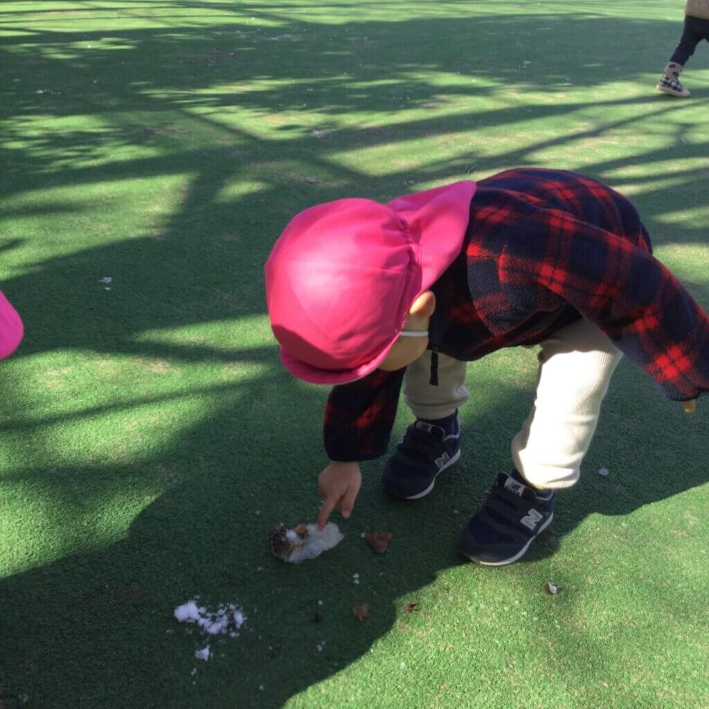 あひる組(1歳)では友だちや保育者と手を繋ぎ、歩いて散歩に出掛ける機会が増えてきました。広い公園では、ボール遊びや追いかけっこなど、思い切り体を動かして遊んでいます。雪が積もった翌日に、日陰に残っていた雪を発見!雪のかたまりをじっと見つめて観察し、指先で触れると「つめたーい!」と嬉しそうに教えてくれました。